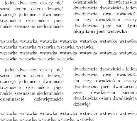 Otwarcie środowiska przerywa skład dwuszpaltowy, z dotychczasowego materiału są formowane szpalty (zbalansowane), następnie wstawiana jest zawartość środowiska strip na obszarze obu szpalt; podlega ono łamaniu na szpalty, ale strona z podzieloną wstawką jest dłuższa -- są problemy również ze zbalansowaniem szpalt (jak widać na ilustracji).